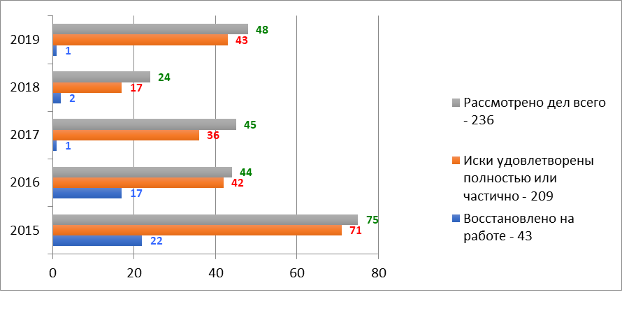 Наибольшее количество дел, рассмотренных в судах с участием правовых инспекторов труда, связано с незаконным увольнением и восстановлением на работе.