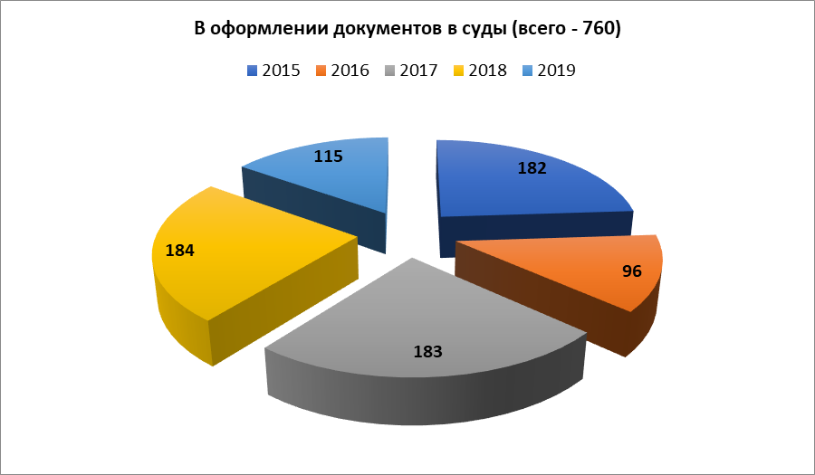 С участием главного правового инспектора в 2019 г. в суде рассмотрено 6 дел (1 - восстановление на работе, 1 – взыскание страховых выплат в связи с гибелью кормильца в результате несчастного случая на производстве, 1 – обжалование отказа в заключении договора социального найма жилого помещения, (2 - восстановление на работе, 1 – взыскание ущерба, причиненного жилому помещению).