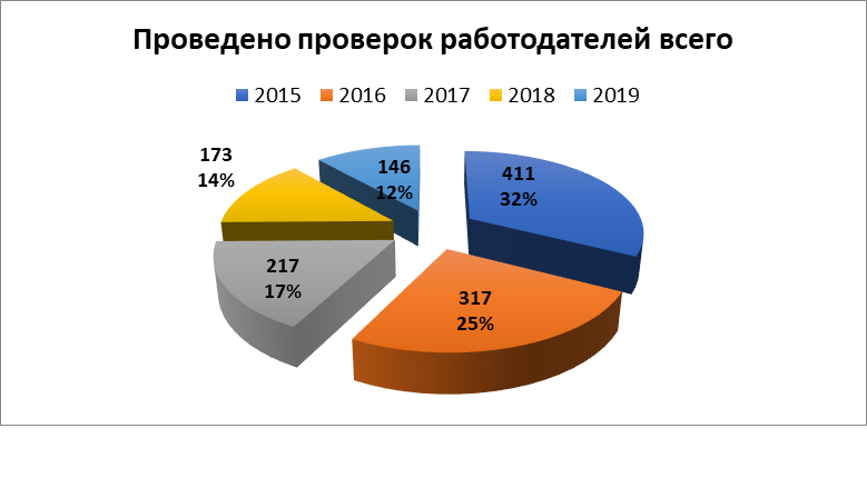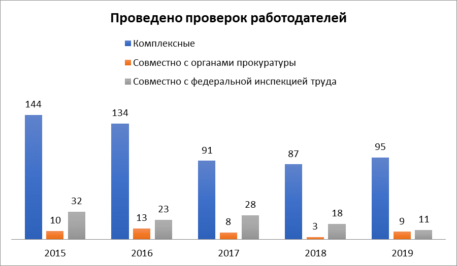 При этом необходимо отметить, что в отчетный период снизилось общее количество проверок работодателей силами профсоюзной правовой инспекции, снизилось количество совместных проверок с органами прокуратуры и федеральной инспекции труда. Этому есть несколько причин: в государстве взят курс на сокращение проверок в отношении предприятий малого и среднего бизнеса, получили распространение проверки с помощью электронных средств информации, работодателей дисциплинирует ряд поправок, принятых в ТК РФ, УК РФ, и КОАП. Вместе с тем, снижение количества проверок не дает оснований говорить о том, что стало меньше нарушений трудовых прав работников со стороны работодателей.